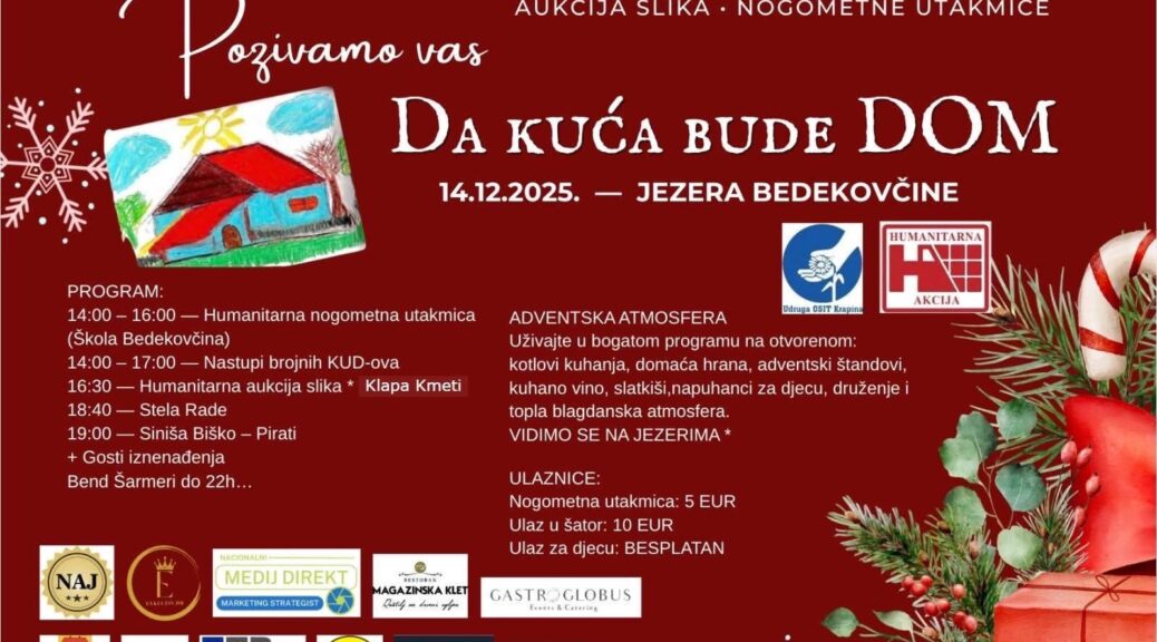 Dragi naši prijatelji, dragi ljudi velikog srca! S ponosom i uzbuđenjem vas pozivamo na humanitarno događanje „Da kuća bude dom“ u nedjelju 14.12. od 14 do 22h na Bedekovčanskim jezerima. Očekuje vas bogat glazbeni i gastro program, aukcija slika, humanitarna prodaja naših ručnih radova, humanitarne utakmice u sportskoj dvorani Srednje škole u Bedekovčini, druženje i dobra zabava, a sve u cilju sakupljanja sredstava za ostvarenje našeg sna, kako bi se završila adaptacija naše kuće iz snova te kako bismo pokrenuli…