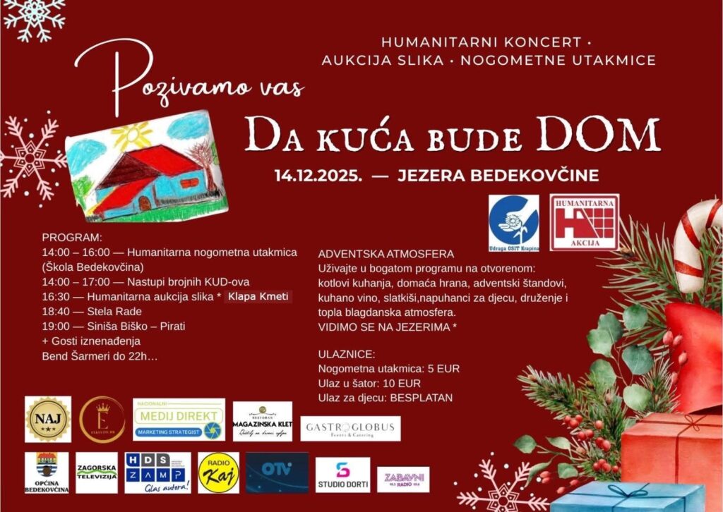 Dragi naši prijatelji, dragi ljudi velikog srca! S ponosom i uzbuđenjem vas pozivamo na humanitarno događanje „Da kuća bude dom“ u nedjelju 14.12. od 14 do 22h na Bedekovčanskim jezerima. Očekuje vas bogat glazbeni i gastro program, aukcija slika, humanitarna prodaja naših ručnih radova, humanitarne utakmice u sportskoj dvorani Srednje škole u Bedekovčini, druženje i dobra zabava, a sve u cilju sakupljanja sredstava za ostvarenje našeg sna, kako bi se završila adaptacija naše kuće iz snova te kako bismo pokrenuli organizirano stanovanje uz podršku za osobe s intelektualnim teškoćama koje je nužno potrebno našim članovima i zajednici.